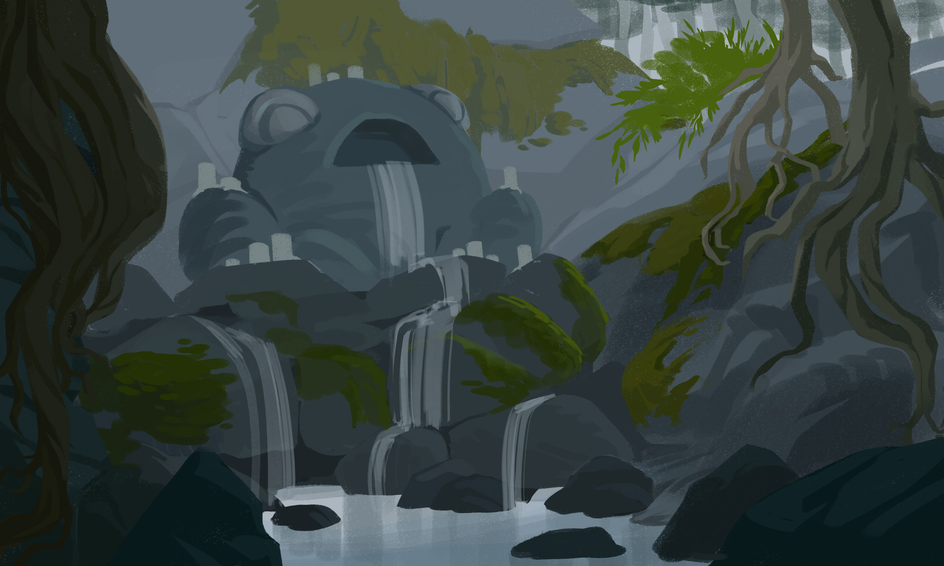 Frog shrine design concept done for a world building class. Focused on implementing photo bashing techniques to apply texture to the scene.